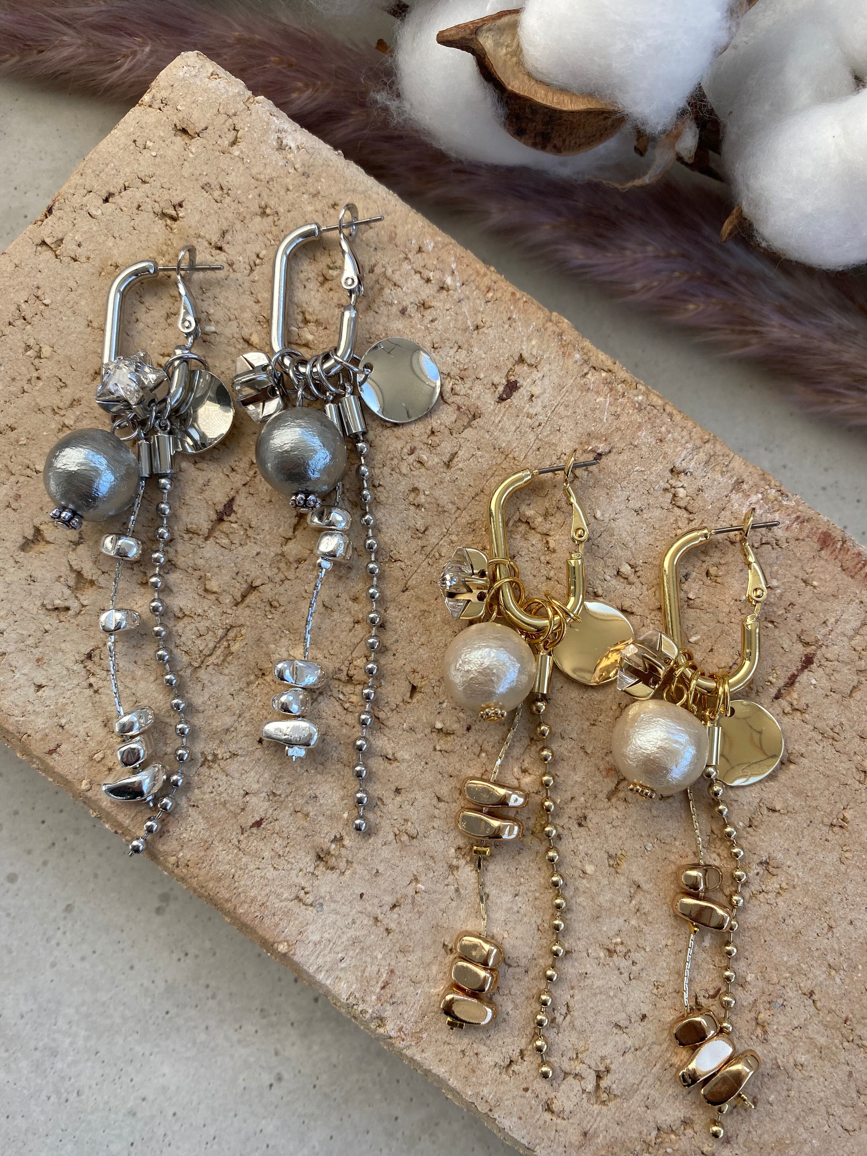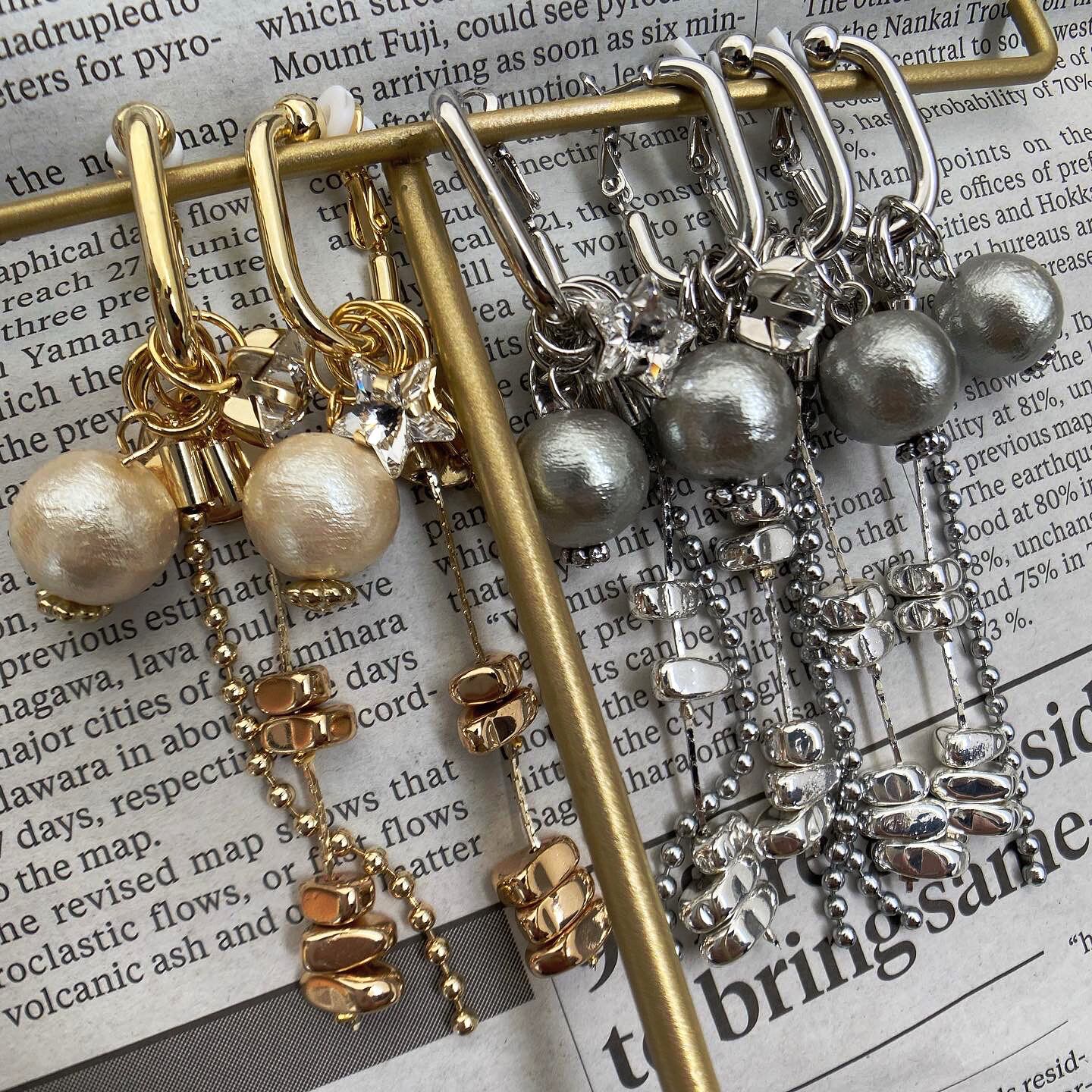 メタルビーズ達のの揺れ感が楽しめる5つのチャーム付きピアス。