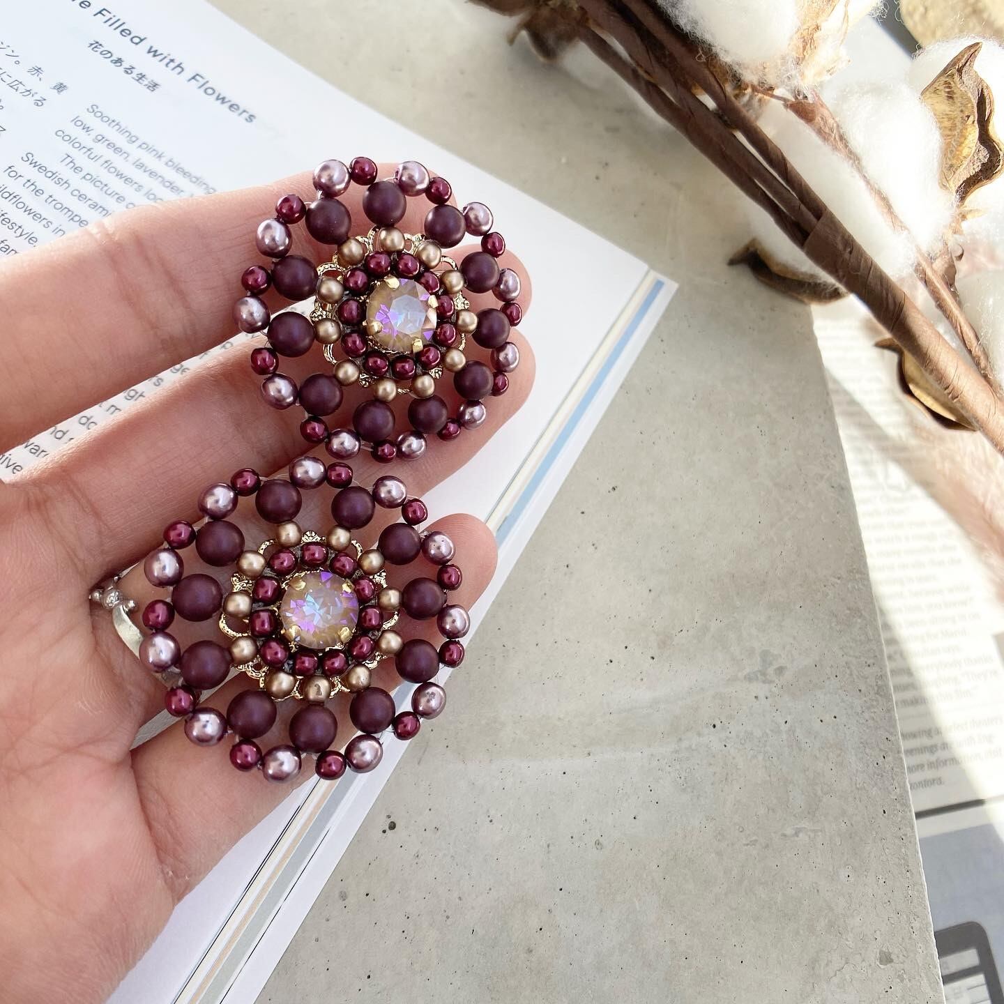 中心にはスワロフスキーを使い、マットパールとの相性が抜群です。透かしパーツに編み込むことで前から見ても後ろから見ても華やかな仕上がりに。